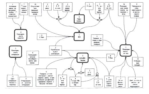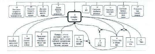 Откачать донный шлам, если расстояние от его поверхности до электродов менее 2. Просветить аккумулятор (стеклянный бак) переносной лампой для отыскания мест соприкосновения пластин. 3. Найти короткозамкнутые пластины с помощью компаса. Компас в пластмассовом корпусе перемещать вдоль соединительных полос над ушками электродов сначала одной, а потом другой полярности. Резкое изменение положения стрелки с обоих сторон электрода указывает на наличие КЗ с этим электродом. 4. В аккумуляторах, работающих при постоянном подзаряде с повышенным напряжением, на отрицательных электродах могут образовываться древовидные наросты губчатого свинца. Их следует соскаблить полоской стекла. 5. В аккумуляторе со свинцовой обкладкой деревянных баков замыкание через донный шлам можно определить, измерив напряжение между электродами и обкладкой. При наличие КЗ оно будет нулевым. У исправного А, находящегося в покое, напряжение «плюс-обкладка» близко к 1,3 В, а «минус-обкладка» - к 0,7 В. 6. Покоробленные электроды проложить новыми сепараторами. Коробление может быть вызвано: - присутствием азота или уксуса в электролите, которые усиливают окисление глубинных слоев положительных электродов; - повышенными токовыми нагрузками (причины № 14 и 15). Состояние аккумулятора - 2. Сульфатация