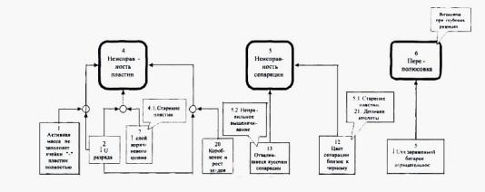 1. Устранить причины но пунктам № 7, 14, 16, 17, 18 , а так же устранить причины примесей в доливочной воде и присутствия хлора в помещении. 2. Нормально, если через 10 лет эксплуатации емкость батареи снизится до 80 % от номинала, а через 15 лет-до 70%. 3. Напряжение батареи должно соответствовать паспорту. |