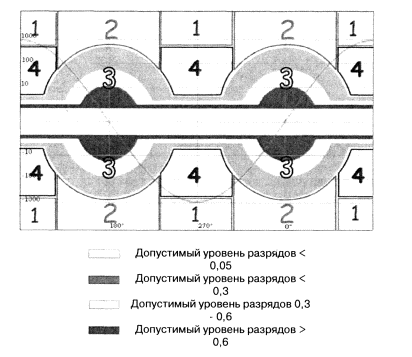 Рис. 3. Допустимые уровни ЧР По окончании всех измерений проводится анализ результатов измерений, представленных в виде параметрических диаграмм, в которых по горизонтали откладывается электрическая фаза испытательного напряжения, по вертикали - заряд импульса в пК. Плотность разрядов показана с помощью цветовой шкалы. Критерии оценки ЧР: В зоне «3» (внутренние разряды) допустимы следующие уровни разрядов: - «красная» зона (низкий уровень разрядов в пK) - плотность разрядов - любая; - «желтая» зона (средний уровень разрядов в пK) - плотность разрядов не должна превышать 0,6 × N/период; - «зеленая» зона (высокий уровень разрядов в пK) - плотность разрядов не должна превышать 0,3 × N/период, где N - количество разрядов этого уровня при данной фазе. Превышение указанных величин плотности разрядов для описанных выше зон свидетельствует о возможном наличии дефекта изоляции (электрическое или температурное старение и т.д.). Заключение о возможности эксплуатации обмотки в этом случае дается с учетом величины и плотности разрядов, выходящих за пределы указанных зон. Наличие частичных разрядов плотностью более 0,05 × N/период в зонах 1 (скользящие разряды), 2 (пазовые разряды) и 4 (коронные разряды) говорит о наличии дефектов изоляции. Заключение о возможности эксплуатации обмотки электродвигателя дается исходя из величины и плотности разрядов в указанных зонах и по результатам визуального осмотра (интенсивность коронирования). 2.3.9. Контроль состояния изоляции листов активной стали и выявления участков с повышенными местными потерями электромагнитным методом контроля (ЭМК) (рис. 4). ЭМК сердечника статора включает: - измерения по пакетам наведенного кольцевым магнитным потоком напряжения; - проведения измерений на всех зубцах расточки статора; - выявление на основе проведенных измерений зубцов активной стали, имеющих повышенные дополнительные потери, и локализацию местоположения замыкания.