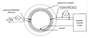 Рис. 4. Схема проведения электромагнитного контроля изоляции листов активной стали ЭМК проводится при выполнении ремонтов с выводом ротора. Метод основан на локации магнитного потока при кольцевом намагничивании сердечника индукцией 0,02-0,05 Тл. Выявление дефектных зон происходит по искажению электромагнитного поля в области замыкания листов. Для измерения применяется специализированный детектор замыкания листов. 2.4. Средства технического диагностирования. 2.4.1. Мегомметр должен быть с классами подаваемого напряжения 500/1000/2500 B, измерять сопротивление изоляции в диапазоне от 50 кОм до 100 ГОм. 2.4.2. Микроомметр должен обеспечивать замер сопротивлений в диапазоне от 1 × 10-3 до 1 Ом вкл. 2.4.3. Эндоскоп технический гибкий предназначен для осмотра внутренних полостей контролируемых изделий и объектов в труднодоступных местах. Осветитель эндоскопа должен обеспечивать освещенность контролируемой поверхности не менее 1300 лк на расстоянии 50мм. 2.4.4. Прибор регистрации частичных разрядов предназначен для регистрации скользящих и коронирующих частичных разрядов, должен иметь диапазон регистрируемых частичных разрядов 85 Db. 2.4.5. Требования к виброизмерителю. Прибор должен удовлетворять общим техническим требованиям к аппаратуре для измерения параметров вибрации по ГОСТ 30296. 2.5. Технические требования по выполнению операций диагностирования. 2.5.1. При проведении диагностики необходимо соблюдение всех требований и указаний ПУЭ, Правил технической эксплуатации электроустановок потребителей, Межотраслевых правил по охране труда (правил безопасности) при эксплуатации электроустановок. 2.6. Режимы работы электродвигателя при проведении диагностики. 2.6.1. Визуальное обследование, измерение сопротивлений изоляции статора, ротора и подстуловой изоляции, измерение сопротивлений обмоток статора и ротора, измерение уровня частичных разрядов, испытание активной стали статора проводятся в режиме останова электродвигателя. 2.6.2. Оценка вибрационного состояния электродвигателя производится на работающем электродвигателя. 2.7. Требования к безопасности при проведении диагностики. 2.7.1. При измерении ЧР, оценке вибрационного состояния, проведении визуального и эндоскопического осмотров, ЭМК выполняются мероприятия, соответствующие требованиям действующих «Межотраслевых правил по охране труда (правил безопасности) при эксплуатации электроустановок» и «Правил технической эксплуатации электроустановок потребителей», в частности: - общие требования безопасности при производстве работ по техническому диагностированию электродвигателей согласно разделам 1 и 2 «Межотраслевых правил по охране труда (правил безопасности) при эксплуатации электроустановок»; - организация работ командированного персонала производится в соответствии с разделом 12 «Межотраслевых правил по охране труда (правил безопасности) при эксплуатации электроустановок»; - технические мероприятия, обеспечивающие безопасность работ со снятием напряжения согласно разделу 3 «Межотраслевых правил по охране труда (правил безопасности) при эксплуатации электроустановок»; - меры безопасности при выполнении работ с электродвигателем согласно пп. 4.4, 5.1, 5.4 «Межотраслевых правил по охране труда (правил безопасности) при эксплуатации электроустановок» и п. 3.6 «Правил технической эк