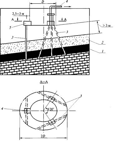 извлеченного средствами дегазации метана Gд i, м3/мин, и газовыделение в вентиляционную сеть Приложение № 3Рекомендации по дегазации неразгруженных угольных пластов1. Рекомендации по дегазации пластов при проведении горных выработок 1. При проведении вертикальных выработок (стволов, шурфов, гезенков) дегазация угольных пластов и пород осуществляется скважинами, пробуренными с поверхности или из камер (рис. 1). Скважины располагаются параллельно выработке на расстоянии 2,5-3 м от ее стенок. Расстояние между забоями скважин составляет 4-5 м. Величина неснижаемого опережения скважинами забоя выработки должна быть не менее 10 м. Газоносный угольный пласт или слой газосодержащей породы перебуривается полностью.