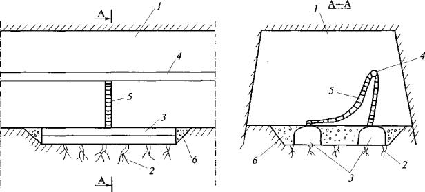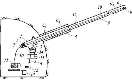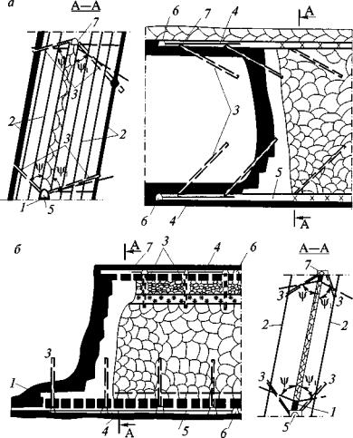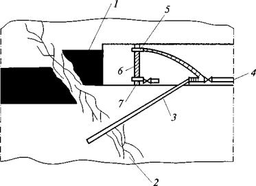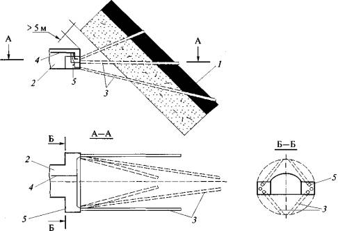массива при проходке вертикальных выработок: 2. При проведении квершлагов дегазация газосодержащего пласта осуществляется скважинами, пробуренными из забоя или из камер (рис. 2). Бурение скважин начинают до подхода забоя квершлага к угольному пласту или газосодержащему слою породы не ближе 5 м.