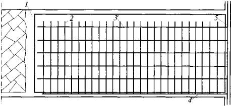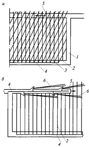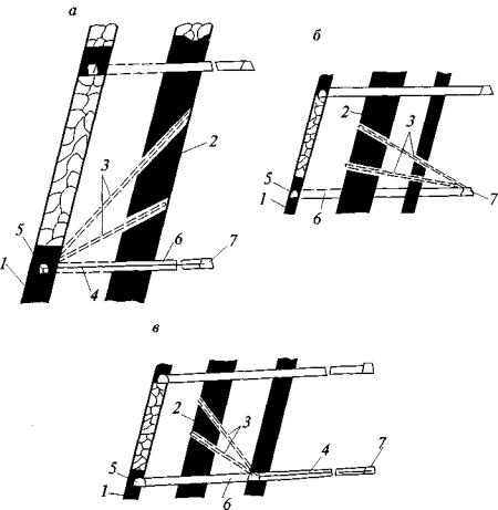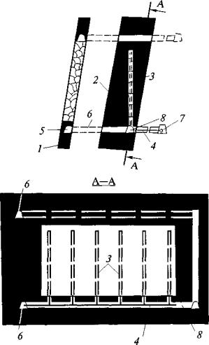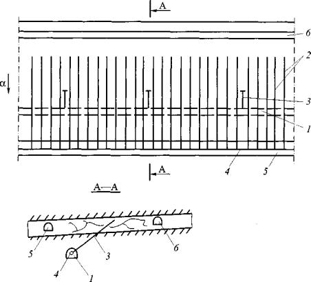 Если парные выработки проводятся с опережением одного из забоев и ширина целика между выработками не превышает 15 м, то бурение барьерных скважин с обеих сторон выработки проводится только для опережающего забоя, а для выработки, проводимой с отставанием, бурение скважин в боковой стенке со стороны целика необязательно. Ранее пробуренные барьерные скважины, расположенные на расстоянии более 100 м от забоя выработки, могут быть отключены от дегазационной сети, если они не влияют на газообильность выработки. 6. Для снижения подсосов воздуха и повышения концентрации метана в каптируемой смеси применяется схема барьерной дегазации массива угля с использованием перекрещивающихся скважин (см. рис. 5,6). По мере удаления забоя выработки барьерные скважины серии I отключают от дегазационного трубопровода и оставляют под вакуумом только короткие скважины серии II. 7. При расположении полевой выработки не далее 30 м от крутого пласта дегазация осуществляется скважинами, пробуренными вкрест простирания пласта (рис. 7). Скважины бурятся из полевого штрека таким образом, чтобы один ряд скважин располагался на 2-4 м выше будущей выработки, а другой ряд скважин - вблизи оси выработки.