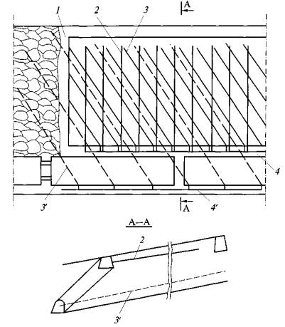 ограждающими скважинами направленного бурения: Барьерные скважины бурятся из камер под углом 3-5° к оси выработки. Длина скважин до 100-150 м. Расстояние между камерами на 15-20 м меньше длины скважин, устья скважин располагаются на расстоянии 2-2,5 м от стенки выработки. Число и расположение барьерных скважин принимаются по табл. 1. Таблица 1 Число и расположение барьерных скважин