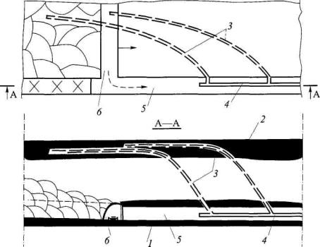 нисходящими скважинами, пробуренными за контуры будущей выработки: В целях сокращения сроков предварительной дегазации пласта следует применять гидроразрыв угольного массива для повышения его газопроницаемости. Дегазация угольного массива вблизи проводимой выработки осуществляется с помощью барьерных или забойных и барьерных скважин в тех случаях, когда невозможно провести предварительную дегазацию угольных пластов. На пластах с высокой газоносностью, когда одной схемой дегазации не удается снизить газообильность проводимой выработки, применяется сочетание (комбинация) нескольких схем дегазации. 5. Если не представляется возможным осуществить предварительную дегазацию угольного пласта, то во время проведения выработки производят бурение барьерных или ограждающих скважин (рис. 5-6).