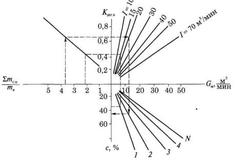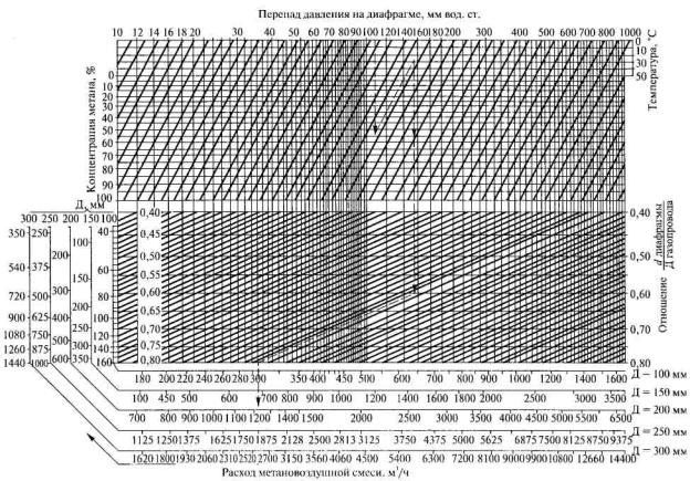 где см - концентрация метана в отсасываемой смеси, %. 7. Расход каптируемой смеси Qг, м3/ч, можно определить по номограмме (рис. 6). По измеренным перепаду давления на диафрагме, концентрации метана и температуре отсасываемой смеси, известным параметрам диафрагмы и газопровода определяются сначала расход метановоздушной смеси, а затем расход метана по формуле (7).