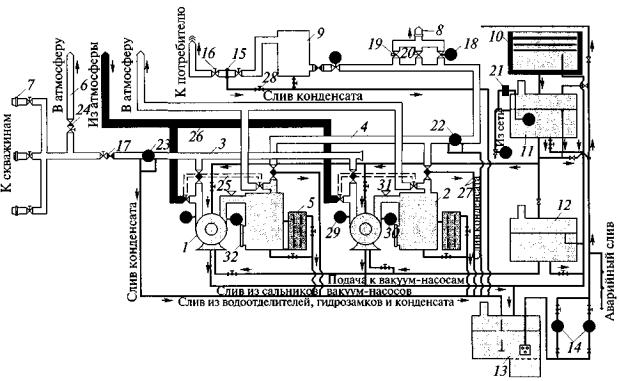 Рис. 1. Упрощенная технологическая схема стационарной ВНС: 5. Характеристики работы вакуум-насосов приведены на рис. 2 и 3.