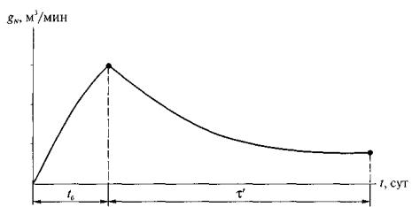 т - полная мощность угольных пачек пласта, м; N', N - число скважин на участке в процессе обуривания и после завершения буровых работ соответственно; g0 - начальное удельное метановыделение в скважину, м3/(м2×сут); а - коэффициент, характеризующий темп снижения во времени газовыделения из пласта в скважину, сут-1;