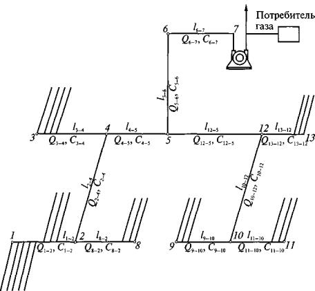 Парные значения Qв.н и Вн.ф наносятся на график и строится уточненная аэродинамическая характеристика вакуум-насоса. 11. Если точки, построенные по координатам фактически измеренных расхода смеси и разрежения на вакуум-насосе, располагаются ниже типовой характеристики (то есть ниже точек с координатами расчетного режима), то следует либо применить газопровод с большим диаметром труб, либо изменить схему соединения вакуум-насосов, обеспечивающую более высокий расход газовоздушной смеси. 12. Для дегазационной сети необходимо принимать такой вакуум-насос (или несколько вакуум-насосов, установленных параллельно), аэродинамическая характеристика которого проходит через точку с координатами расчетного (типового) режима расхода смеси и разрежения или выше нее. 13. Решение о прекращении работ по дегазации шахт или временной консервации дегазационной системы принимается техническим советом угольной компании (акционерного общества, шахты) с участием представителей проектной организации. Решение технического совета должно быть оформлено протоколом. Измененный проект должен пройти экспертизу промышленной безопасности (ст. 8 Федерального закона от 21.07.97 № 116-ФЗ «О промышленной безопасности опасных производственных объектов»). 3. Расчет газопроводов, выбор вакуум-насосов 3.1. Система, работающая в режиме всасывания 14. Расчетная сеть представляет собой схему соединения газопроводов. Начальными ветвями сети являются участки, к которым подключаются дегазационные скважины, конечной ветвью - участок, подводящий к вакуум-насосу. Промежуточными ветвями являются участки газопровода, имеющие постоянные дебиты метана и диаметр. Начало и конец ветви считаются по ходу движения смеси. Ветвь - участок газопровода, заключенный между двумя соседними узлами разветвления трубопровода или между скважинами и узлом разветвления. Узел - пункт, объединяющий не менее трех ветвей газопровода. Расчет сводится к определению следующих параметров ветвей газопровода: дебита смеси, концентрации метана в смеси, давления в начальной и конечной точках ветви, диаметра газопровода и проверке действующих или выбору новых вакуум-насосов. Составляется схема для расчета газопроводов (рис. 1) с учетом развития горных работ на наиболее трудный период эксплуатации дегазационной системы с указанием расчетной длины ее ветвей.