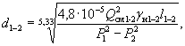 где Lт - длина трубопровода в наиболее загруженной и протяженной ветви дегазационной системы, м. 24. Рассчитывается давление Р2, мм рт. ст., на выходе из участкового газопровода, входящего в наиболее протяженную и загруженную ветвь дегазационной системы: Р2 = Р1 - DРуд l1-2 (20) 25. Определяется средняя плотность метановоздушной смеси gн1-2, кг/м3, при нормальных условиях по формуле gн1-2 = 5,37×10-3(224 - с1-2), (21) где с1-2 - концентрация метана в газовоздушной смеси участкового газопровода (ветвь 1-2 на рис. 1), %. 26. Определяется внутренний диаметр участкового газопровода d1-2, м (ветвь 1-2 на рис. 1), входящего в наиболее протяженную и загруженную ветвь дегазационной системы: