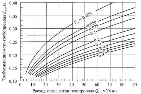 Рис. 4. Определение диаметра газопровода В соответствии с действующими ГОСТами выбираются стандартные диаметры труб dст i. Сравниваются требуемые диаметры каждой ветви газопроводов с фактическими dф i. Для ветвей, где dф i < dтр i, принимается решение о замене трубопроводов. При этом сначала проектируется замена труб наиболее протяженной и загруженной ветви дегазационной системы. Если нет возможности заменить газопровод, находящийся в эксплуатации, на газопровод диаметром dтр i, то проектируется прокладка дополнительного газопровода, диаметр которого dд i, м, рассчитывается по номограмме (рис. 5) или по уравнению