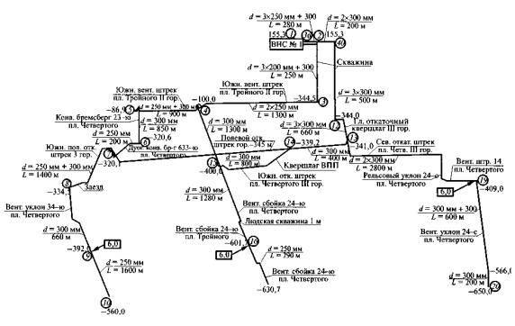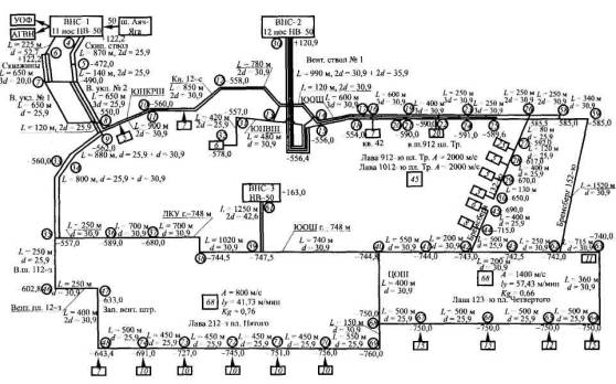 Рис. 7. Расчетная схема дегазационных трубопроводов шахты «Северная» (ОАО «Воркутауголь»):