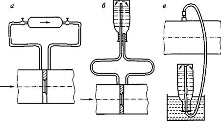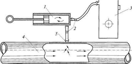 Рис. 2. Схема отбора проб газовоздушной смеси: Для лабораторного анализа пробы газа отбираются в бюретки Зегера, бутылки вместимостью 250 см3 или в резиновые камеры. При измерениях на замерных устройствах с диафрагмой целесообразно использовать переносной или стационарный варианты прибора БЭПР-ТВ модели 1-1 или 1-2 и U-образный манометр, а при измерениях на замерных устройствах без диафрагмы - переносной анемометр АПР-2 с зондом Т-1 или с зондом А-2 (при замерах в коробе) либо стационарный погружной расходомер-счетчик газа вихревой ИРВИС ПЗ-30 или модели анемометров фирмы Hontzsch GmbH (Германия). Стационарные приборы позволяют осуществлять непрерывный контроль за параметрами газовой смеси, производить вычисления и передавать информацию на ПЭВМ. 2. Замерное устройство с диафрагмой располагается на прямом участке газопровода. Минимальная длина прямого участка газопровода до и после диафрагмы выбирается в зависимости от типа и модуля сужающего отверстия согласно требованиям Правил измерения расхода газов и жидкостей стандартными сужающими устройствами (РД 50-213-80). Состояние диафрагмы и ее аэродинамическое сопротивление целесообразно определять во время проведения вакуумно-газовой съемки в дегазационном трубопроводе. 3. Замерные устройства без диафрагмы располагаются на прямых участках газопровода в соответствии с рекомендациями, предусмотренными руководством по их эксплуатации. Измерения расхода газовой смеси стационарными приборами выполняются в соответствии с ГОСТ 8.361-79 «ГСИ. Расход жидкости и газа. Методика выполнения измерений по скорости в одной точке сечения трубы». 4. Все замерные устройства, предназначенные для применения стационарных приборов, должны дополнительно оборудоваться врезками для использования переносных приборов. 5. Расход Q, м3/мин, смеси отсасываемых газов на замерном устройстве с диафрагмой рассчитывается по формуле