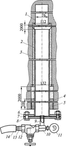 где см i - концентрация метана в i-м пункте замера, %. 7. Давление газа в дегазационном трубопроводе Рт, мм рт. ст., в пунктах замера находится по формуле Рт = Рш -Вт i , (2) где Рш - давление воздуха в шахте (в месте производства замеров), мм рт. ст.; Вт i - разрежение газа в i-м пункте дегазационного трубопровода, мм рт. ст. 8. Фактические потери давления газовоздушной смеси на отдельных участках газопровода определяются как разница измеренных величин давления газа на концах исследуемого участка газопровода. 9. Значения фактических и расчетных (или нормативных) потерь давления газа на участках (ветвях) газопровода заносятся в таблицы. При этом все величины метановоздушных потоков должны быть приведены к нормальным условиям. 10. Сопоставлением фактических подсосов воздуха и нормативных (или проектных) оценивается состояние дегазационного трубопровода и выявляются нарушенные его участки, если таковые имеются. 11. Для оценки состояния дегазационной сети и контроля ее работы целесообразно использовать компьютерную программу «Дегазация» (ООО «Информ ТБ Уголь»). Приложение № 22Проверка качества герметизации скважин1. Определение мест подсосов воздуха в скважину производится специалистами службы дегазации совместно с буровыми мастерами после герметизации скважины, а также в тех случаях, когда содержание метана в участковом газопроводе или эффективность дегазации ниже принятых в проекте. 2. Места подсосов воздуха определяются путем измерения расхода газовоздушной смеси из скважины и содержания метана по ее длине. 3. Отбор проб газа из скважины производят с помощью специального зонда (рис. 1). В его комплект входит тройник с патрубками 2 и 3. Патрубок 2 служит для ввода в скважину штанг 8, а патрубок 3 для соединения скважины 6 с газопроводом 4. На конце патрубка 2 имеется уплотнительный элемент 7, препятствующий подсосам воздуха в скважину при перемещении штанг. Штанги 8 соединяются муфтами. На первой штанге установлено газоотборное устройство 9. Для отбора проб газа в комплекте зонда имеется гибкая трубка 10, намотанная на катушку 11, двухклапанный насос 12 и камера 13. 4. Работы по зондированию скважины выполняют в следующем порядке. С помощью диафрагмы, установленной на обсадной трубе, измеряют расход газовой смеси, содержание в ней метана и разрежение. Затем отключают скважину от газопровода, снимают патрубок с диафрагмой и на его месте крепят к обсадной трубе 5 тройник 1. Патрубок 3 с помощью гофрированного шланга 14 соединяют с газопроводом 4. Через уплотнительный элемент 7 вводят первую штангу с газоотборным устройством 9. Гибкую трубку 10 соединяют с газоотборным устройством и крепят к штангам. Всасывающий патрубок насоса 12 соединяют со свободным концом гибкой трубки 10, а нагнетательный - с камерой 13. Зонд готов к работе.