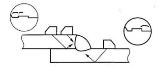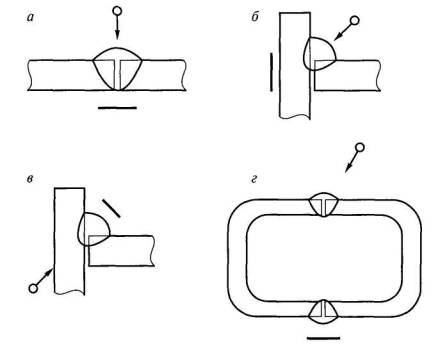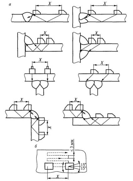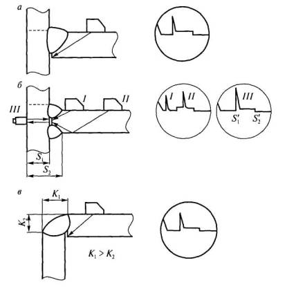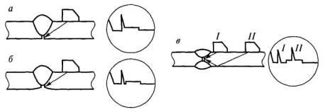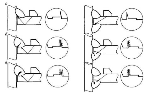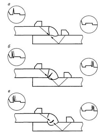 Рис. 2.14. Выявление дефектов в корне швов тавровых соединений, выполненных без разделки кромок Контроль нахлесточных соединений. Соединения рекомендуется контролировать по схемам, приведенным на рис. 2.15.