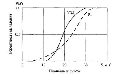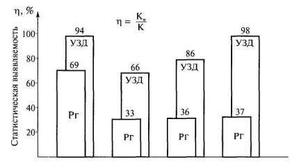Рис. 2.2. Статистическая выявляемость плоскостных дефектов в сварных соединениях ультразвуковой дефектоскопией (УЗД) и радиографией (Рг) [12-15] (К - общее количество дефектов; Кв - количество выявленных дефектов)