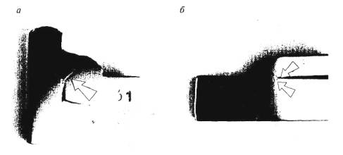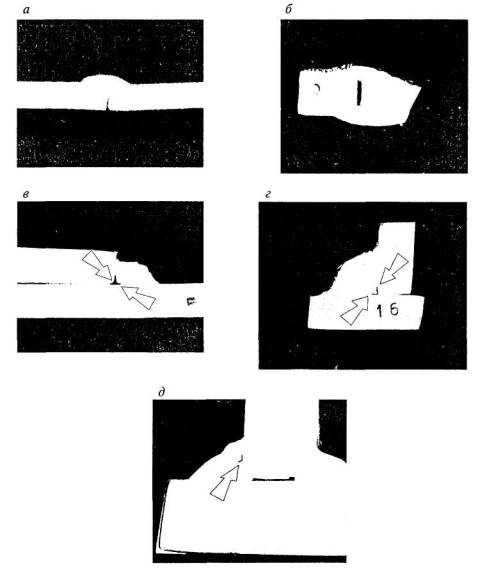 Внутренние трещины, как правило, располагаются в корне швов и начинаются от конструктивных непроваров в тавровых (рис. 2.5, а) и от зазоров в нахлесточных соединениях (рис. 2.5, б).