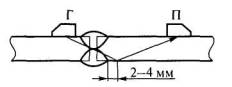 Рис. 2.10. Схема контроля зеркально-теневым методом (Г - генератор, П - приемник) Контроль стыковых соединений. Наиболее вероятными выявляемыми дефектами являются непровары в корне швов. В односторонних соединениях корневой непровар выявляется прямым лучом и максимум эхо-сигнала от него располагается на переднем фронте строб-импульса (рис. 2.11, а). При толщинах сваренных элементов до 6 мм из-за деформации (подтягивания) соединения эхо-сигнал от непровара может быть смещен влево (рис. 2.11, б). В двухсторонних соединениях непровар в корне шва может быть выявлен как прямым, так и однократно отраженным лучом (рис. 2.11, в). При этом максимум эхо-сигнала от непровара располагается примерно на равных расстояниях от зондирующего импульса и переднего фронта строб-импульса при контроле прямым лучом или примерно на середине строб-им пульса при контроле однократно отраженным лучом. В двухсторонних соединениях непровары в корне шва выявляются значительно хуже, чем в односторонних.