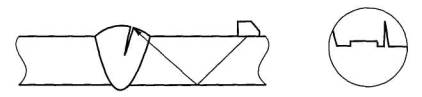 Рис. 2.7. Шлаковое включение, расположенное в средней части шва В некоторых случаях ширина раскрытия конструктивного непровара в тавровом соединении или зазора в нахлесточном соединении в их начальной части из-за действия усадочных сил увеличивается, и может появиться поверхность, ориентированная перпендикулярно ультразвуковому лучу (рис. 2.8).