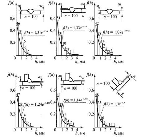 Рис. 3.2. Распределение глубин непроваров в стыковых сварных соединениях Из анализа полученных данных можно сделать вывод, что с увеличением толщины свариваемых элементов наряду с увеличением долей дефектности по подрезам и непроварам увеличивается вероятность появления подрезов и непроваров, имеющих большую глубину. Это, как и в отношении вероятности появления дефектов, связано с тем, что с увеличением толщины свариваемых элементов сварка проводится на режимах с большим сварочным током, что увеличивает вероятность появления подрезов, имеющих большую глубину, и при больших толщинах сложнее обеспечить полный провар свариваемых элементов, вследствие чего увеличивается вероятность появления более глубоких непроваров. На глубину непроваров также оказывают влияние другие факторы: снятие кромки, наличие подкладной пластины, одностороннее или двухстороннее сварное соединение. 3.4. ОЦЕНКА ВЛИЯНИЯ ДЕФЕКТОВ НА НЕСУЩУЮ СПОСОБНОСТЬ СВАРНЫХ СОЕДИНЕНИЙВлияние дефектов на усталостную прочность сварных соединений многократно исследовалось [22, 23, 26, 27, 29, 30]. В настоящее время при оценке влияния дефектов на несущую способность сварных соединений нашли применение: метод прямого эксперимента; метод, использующий аппарат механики разрушения; метод концентрации напряжений. Каждый из методов имеет свои достоинства, недостатки и пределы применимости. Метод прямого эксперимента предусматривает прямое испытание сварных соединений с дефектами. Это основной метод накопления экспериментальных данных о влиянии дефектов на несущую способность сварных соединений. Исследования опасности дефектов основаны на прямых испытаниях сварных соединений с естественными или искусственными дефектами сварки. Преимуществом данного метода является возможность оценки опасности практически всех возможных видов дефектов. Экспериментальная оценка сводится, как правило, к определению предела выносливости сварного соединения в зависимости от типа, размеров и взаимного расположения в нем дефектов. Этот метод вследствие неповторимости однотипных дефектов по геометрической форме и расположению их в сварном шве не позволяет получить обобщенную оценку работоспособности сварных соединений с дефектами. Кроме того, для оценки влияния конкретного дефекта на усталостную прочность сварного соединения требуется выполнить большой объем работ, в том числе долговременных испытаний [24, 31-33]. Вследствие этого применение метода прямого эксперимента достаточно ограничено. Достижения механики разрушения в части оценки роста трещин позволяют для плоскостных (трещиноподобных) дефектов, к которым относятся подрезы и непровары, применить аппарат механики разрушения [34-40]. Объясняется это следующим: уровень напряжений в машиностроительных конструкциях, работающих при переменных нагрузках, существенно ниже предела текучести металла; многолетний опыт изучения изломов усталостного многоциклового разрушения показал, что основным характерным признаком этих изломов является практически полное отсутствие пластической деформации в поперечном сечении излома, что, в свою очередь, свидетельствует о протекании процесса разрушения в условиях плоской деформации; сварочные дефекты типа непроваров и подрезов являются предельно острыми концентраторами, и инкубацион