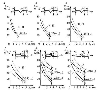где ΔKtho - размах порогового коэффициента интенсивности напряжений при отнулевом цикле нагружения; R - характеристика цикла; γ - численный коэффициент, полученный из экспериментальных данных, γ = 0,75; h - глубина дефекта (для консервативной оценки принимается h = const); С - численный коэффициент, значение которого зависит от формы и расположения дефекта по отношению к силовому потоку. Разброс значений предела выносливости целесообразно определять, принимая во внимание разброс значения коэффициента интенсивности напряжений, то есть S(σгд) = f[S(ΔKtho)]. Значения численного коэффициента С для наиболее распространенных сварных соединений и дефектов известны [41]. Учитывая, что величину и характер распределения остаточных напряжений в сварных конструкциях прогнозировать сложно, зависимости σ-1д = f(h) целесообразно рассчитывать с учетом максимально возможных (предельных) растягивающих напряжений: σост = σт. Влияние остаточных напряжений учитывается изменением характеристики цикла [41]: R = (σт - Δσ)/σт,где σт - предел текучести; Δσ - размах действующих напряжений. Для получения консервативной оценки влияния дефектов на предел выносливости соединений (рис. 3.3) расчеты проведены для стали 10ХСНД. Из широко применяемых при изготовлении конструкций машин низколегированных сталей данная сталь имеет максимальную величину предела текучести σт = 390 МПа. Известно пороговое значение коэффициента интенсивности напряжений для околошовной зоны сварных соединений из стали 10ХСНД, выполненных полуавтоматической сваркой в среде углекислого газа: (ΔKtho)cp = 9,2 МПа м1/2, S(ΔKtho) = 1,04 МПа м1/2 [42]. Рис. 3.3. Влияние дефектов на предел выносливости односторонних (а, б, в, г) и двухсторонних (д, е) стыковых соединений (П - подрезы, Н - непровары) Более обобщенные результаты по оценке влияния дефектов на работоспособность сварных соединений по сравнению с методом прямого эксперимента, так же как метод, использующий аппарат механики разрушения, дает подход, основанный на изучении концентрации напряжений в зоне расположения дефектов. Этот метод применим для оценки влияния на несущую способность сварных соединений объемных дефектов - пор и округлых шлаковых включений [43]. В общем случае концентрация напряжений характеризуется теоретическим коэффициентом концентрации as, равным отношению максимального напряжения в зоне концентрации напряжений к номинальному напряжению при упругой деформации в предположении, что материал отвечает условиям сплошной однородной среды. Метод концентрации напряжений основывается на положении, что разрушение происходит от концентраторов, у которых коэффициент концентрации напряжений в упругой зоне максимален. При таком подходе все дефекты в сварном шве рассматриваются как концентраторы напряжений и при оценке их опасности должны быть сопоставлены теоретические коэффициенты концентрации напряжений от дефектов и формы сварного шва. Установлено [43], что концентрация напряжений, вызванная формой шва, может оказывать на работоспособность сварных соединений более сильное влияние, чем концентрация от расположенных внутри дефектов - несплошностей. На этом основании предложено [43] оценку допустимости дефектов в сварных швах производить сопоставлением теоретических коэффициентов концентрации напряжений от формы сварного соединения (шва) aс и от в