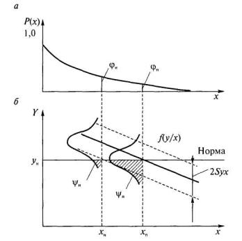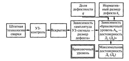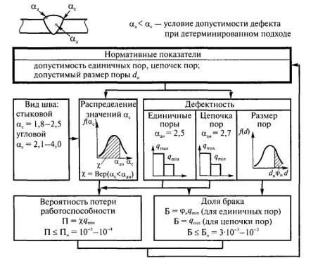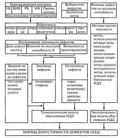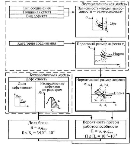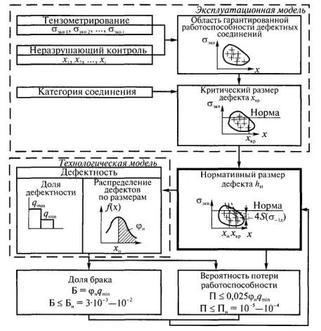 Рис 3.4. Вероятностные модели определения нормативного хн и порогового хп размеров дефекта: а - вероятность появления дефектов; б - регрессия влияния дефектов на прочность Y соединения Влияние дефектов размером X на прочность Y выражается регрессией Y=f(X), а также условным распределением f(у/x). Пересечение линии регрессии и нормативного уровня прочности сварного соединения ун соответствует так называемому пороговому размеру хп дефекта. Для Х = хп вероятность влияния дефекта на прочность ψп = 0,5. Для оценки норм допустимости дефектов рекомендуется использовать понятия их запаса по размеру ηх и по вероятности ηвер ηх = хп/ хн; ηвер = φп ψп/φн ψн = 0,5 φп/φн ψн. В случае, когда ηх > 5 - 10 и ηвер > 10 - 50, нормы условно считают технологическими, в противном случае нормы эксплуатационные. Однако предложенная оценка норм только характеризует опасность влияния дефектов нормативных размеров относительно пороговых. Предлагается при разработке норм допустимости дефектов в сварных соединениях на основе вероятностных моделей оценивать показатели, которые напрямую связаны с интересами потребителя (вероятность потери работоспособности) и производителя (доля брака) [27, 52]. Вероятность потери работоспособности из-за наличия дефектов определяется по формуле П = φн ψнq. В соответствии с требованиями, предъявляемыми к деталям (элементам конструкций) автомобильного, железнодорожного и морского транспорта, сельскохозяйственных, горных, дорожностроительных и подъемно-транспортных машин, величина П не должна быть более 10-5 - 10-4 [53, 54]. Ожидаемая доля брака Б может быть рассчитана по формуле Б = φнq.Исследования, проведенные в МГТУ им. Н.Э. Баумана, показали, что оптимальные доли брака при изготовлении сварных конструкций (при отсутствии причин, вызывающих повышенный уровень дефектности) составляют (2-7)·10-2 [1]. Эти данные получены при контроле сварных элементов длиной 300 мм. Учитывая, что в условиях стабильного производства преобладают единичные дефекты и вероятность забраковки элемента из-за наличия двух и более дефектов, как показали исследования, не превышает 10-5, можно предположить, что при длине элементов 40 мм доля брака уменьшается в 7,5 раза (ΔL300/ΔL40 = 300/40 = 7,5). Следовательно, при использовании единичных участков протяженностью 40 мм приемлемый уровень брака, который может быть взят за нормативное значение доли брака Б, составляет 3·10-3 - 10-2. 3.7. МЕТОДЫ ОБОСНОВАНИЯ НОРМ ДОПУСТИМОСТИ ДЕФЕКТОВОбобщенная схема обоснования норм допустимости дефектов представлена на рис. 3.5. Для формирования технологических требований к нормам допустимости дефектов по результатам неразрушающего контроля и выборочного вскрытия как эталонного метода определяется «картина качества», которая отражает достигнутый уровень качества сварных конструкций (или уровня, который может быть достигнут). «Картина качества» представляется в виде диаграмм (или таблиц) распределения дефектов по видам и законов (гистограмм) их распределения по размерам. При этом на частоту появления и размеры непроваров в стыковых соединениях и подрезов как значительных дефектов (часто встречаются, оказывают существенное влияние на несущую способность соединений, и их появление трудно предотвратить) необходимо оценить влияние таких факторов, как тип сварного соединения и толщина свариваемых элементов.