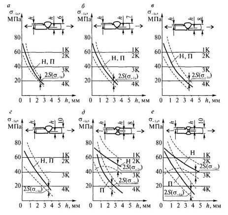 Рис. 3.6. Схема обоснования норм допустимости дефектов на основе применения аппарата механики разрушения Показателем нагруженности изделий, испытывающих случайный режим нагружения и работающих в области многоцикловой усталости, рекомендуется использовать величину эквивалентного (приведенного) напряжения σэкв, дающего на принятой базе такую же повреждаемость, что и реальный спектр нагружения. В случае если σ-1д и σэкв представляют собой амплитуды симметричных циклов, дающих одинаковую повреждаемость на базе 2·106, величина σ-1д на зависимостях σ-1д = f(h) (см. рис. 3.3) может быть заменена на величину σэкв. Для повышения экономичности сварочного производства целесообразно введение категорий сварных соединений в зависимости от показателя нагруженности σэкв [28]. Предложены следующие категории: 1-я - σэкв>60 МПа; 2-я - 60 Мпа≥σэкв>40 МПа; 3-я - 40 МПа≥σэкв>20 МПа; 4-я - σэкв ≤ 20 Мпа (рис. 3.7). На примере стыковых соединений (табл. 3.2) видно, что принятые нормативные уровни нагруженности реализуют удобные для выбора нормативных значений глубин hн непроваров и подрезов пороговые значения hп. Для соединений 1-й категории наличие дефектов даже малых величин - 0,5-1,0 мм приводит к недопустимому снижению их несущей способности. Таким образом, дефекты в данных соединениях недопустимы. Рис. 3.7. Категории качества односторонних (а, б, в, г) и двухсторонних (д, е) стыковых соединений (П - подрезы, Н - непровары, К - категории) В соединениях 2, 3 и 4-й категории в зависимости от типа соединения и толщины свариваемых элементов реализуются различные пороговые значения hп глубин дефектов. Нормативные величины (табл. 3.2) выбраны таким образом, чтобы при достигнутом уровне дефектности вероятность потери работоспособности П и ожидаемая доля брака Б не превышали 10-5 - 10-4 и 3·10-3 - 10-2 соответственно. Таблица 3.2Оценка норм допустимости непроваров и подрезов в стыковых соединениях