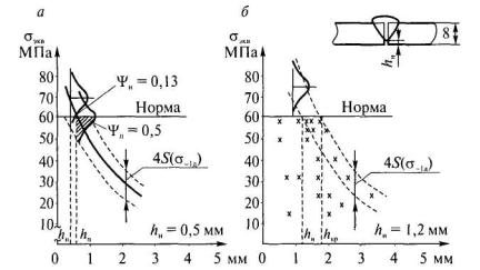 Рис. 3.8. Схема обоснования норм допустимости дефектов на основе тензометрирования конструкций При формировании эксплуатационных требований к нормам допустимости дефектов необходимо оценить влияние дефектов на работоспособность сварных соединений. Этапы построения эксплуатационной модели: 1. По результатам тензометрирования конструкций для исследуемых сварных элементов определяют значения показателя нагруженности (σэкв1, σэкв2, ..., σэквi). 2. По результатам измерений для поверхностных дефектов или вскрытия с последующими измерениями для внутренних дефектов определяют характерные размеры дефектов (х1, х2, ..., хi, где i - порядковый номер элемента). 3. Наносят точки с координатами (σэкв, хi) на график. Таким образом, получают области «гарантированной работоспособности» дефектных сварных соединений. 4. Пересечение нормативного уровня нагруженности, соответствующего определенной категории сварного соединения, с правой границей «поля работоспособности» определяет критическое значение глубины дефекта хкр. При х < хкр можно предположить, что сварное соединение «выдержит» нормативное значение σэкв без разрушения. 5. Для получения консервативной оценки хн откладывают от крайне правых точек зону, определяемую разбросом ±2S(σ-1д). Сопоставление результатов нормирования непроваров в ответственном стыковом шве стрелы машины ЛП-33 на основе использования аппарата механики разрушения и на основе результатов тензометрирования и ускоренных испытаний конструкций (рис. 3.9) показало, что при использовании результатов тензометрирования нормативный размер (глубина) hн дефекта без ущерба для надежности может быть увеличен более чем в 2 раза (с 0,5 до 1,2 мм).
