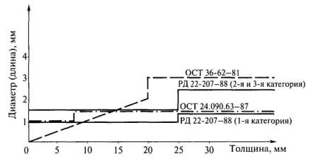 ОСТ 36-62-81 и ОСТ 24.090.63-87 применялись 19 и 11 лет соответственно, а РД 22-207-88 действует и в настоящее время. ОСТ 36-62-81 и ОСТ 24.090.63-87 заменены на РД 36-62-00 и РД 24.090.97-98 соответственно. Однако требования к качеству сварных конструкций не изменились, за исключением того, что общая длина допустимых местных наплывов на участке шва 1000 мм уменьшилась со 100 мм (ОСТ 24.090.63-87) до 10 мм (РД 24.090.97-98). Приведенные в них нормы допустимости дефектов являются технологическими, и так как они обеспечивают безопасную эксплуатацию сварных конструкций, то могут быть взяты за основу при совершенствовании норм. При этом могут быть сняты требования к качеству соединений, которые не связаны с влиянием дефектов на несущую способность конструкций. Так как в конструкциях одного типа кранов могут быть как более, так и менее нагруженные швы по сравнению со швами сварных соединений другого типа кранов, то могут быть разработаны единые нормы для сварных конструкций грузоподъемных кранов. При разработке рекомендуемых норм допустимости дефектов должен быть проведен анализ апробированных норм и за основу взяты наиболее «мягкие». Этот подход наиболее целесообразен при обосновании требований к качеству ремонтной сварки, так как при ремонтной сварке существенно выполнение только эксплуатационных требований, а технологическим фактором можно пренебречь (объемы сварочных работ невелики - сварке подлежат только отдельные швы). Причем в этом случае эксплуатационные требования могут быть определены с большим консерватизмом, чем при изготовлении конструкций. Дефекты могут быть нормированы на основе применения зависимостей «размер дефекта - толщина свариваемых элементов» (рис. 3.13). На рис 3.14 в качестве примера приведены предельно допустимые размеры поверхностных пор и раковин.