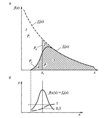 Рис. 4.2. Определение функции выявляемости Wi(x) как интегральной функции Fв(x) кривой ошибок fв(x) =f(x/y) Рекомендуется графический расчет оценки достоверности контроля. Нормативная величина дефекта делит поле дефектности на четыре области: необнаруженные (1 и 2) дефекты - допустимые (1) или недопустимые (2) и обнаруженные (3 и 4) - недопустимые (3) или допустимые (4). Вероятность Рг (область 1) наличия годных элементов характеризует общую их засоренность малозначительными дефектами. Вероятность Рн (область 3) отражает наличие негодных элементов и особенности контроля - по степени усечения области 3 функцией выявляемости. Области ошибок 2 и 4 соответствуют вероятностям Рβ и Рα и аналогичны рискам потребителя β и поставщика α.