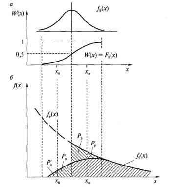 Рис. 4.4. Модель интервальной оценки достоверности по количественному признаку: а - кривые выявляемости fв(х) и Fв(x); б - распределения fр(х) и f0(х) Таблица 4.1Матрица оценки сравнительной достоверности методов контроля по числу проверенных элементов (альтернативный признак)