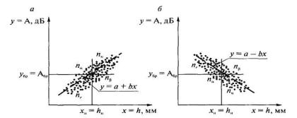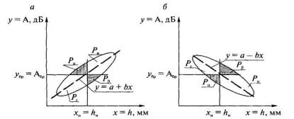 Возможны четыре варианта сочетаний принятия решений: nг, nн, пα и пβ. Несовпадающим сочетаниям пα и пβ соответствует риск поставщика α (перебраковка) и риск потребителя β (недобраковка). Достоверность может быть рассчитана по формулам: Дα = (nΣ - пα)/nΣ = 1 - пα/nΣ; Дβ = (nΣ - пβ)/nΣ = 1 - пβ/nΣ; ДΣ = (nΣ - пα - пβ)/nΣ = 1 - (пα + пβ)/nΣ. Так как недобраковка опаснее перебраковки, можно сделать вывод, что показатель ДΣ достаточно хорошо защищает интересы поставщика и не в полной мере потребителя. Учитывая это, предлагается совместно с показателем ДΣ использовать показатель Дβ, который учитывает только недобраковку. Рассмотрим корреляционные поля регрессий «амплитуда ультразвукового сигнала А - глубина непровара h» (рис 4.5), полученные по результатам ультразвукового контроля и вскрытия соединений, сваренных с соблюдением штатной технологии.