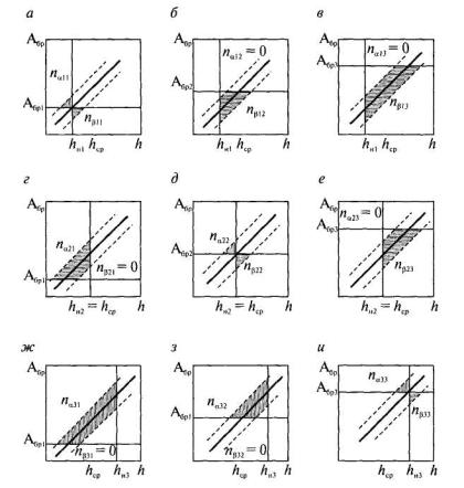 Однако использование теоретических распределений значительно усложняет оценку достоверности, так как при этом возникает необходимость определения законов распределения исследуемых величин [63]. Поэтому, как правило, при расчетах ДΣ и Дβ используют эмпирические корреляционные поля регрессий «амплитуда ультразвукового сигнала А - глубина непровара h». При этом необходимо иметь в виду, что корреляционные поля не содержат «точек», соответствующих элементам, в которых дефекты были пропущены при ультразвуковом контроле (в зависимости от размера дефекта дополняют группы пг и пβ). Принимая ряд значений гипотетически за Aбр, на основе корреляционных полей «амплитуда ультразвукового сигнала А - глубина дефекта h» можно получить зависимость показателей достоверности ДΣ и Дβ от браковочного уровня Aбр [56]. При hн < hср (рис. 4.7, а, б, в) максимальная достоверность обеспечивается при минимальном браковочном уровне Aбр = Aбр1 и с увеличением браковочного уровня Aбр1 < Aбр2 < Aбр3 достоверность ДΣ снижается (пα11 + пβ11 < пβ12 < пβ13). Если hн ≈ hср (рис. 4.7, г, д, е), то зависимость ДΣ от Aбр имеет максимум при Aбр ≈ Aбр2 (пα22 + пβ22 < пα21 и пα22 + пβ22 < пβ23). В случае hн > hср (рис. 4.7, ж, з, и) зависимость ДΣ от Aбр возрастающая (пα33 + пβ33 < пα32 < пα31).
