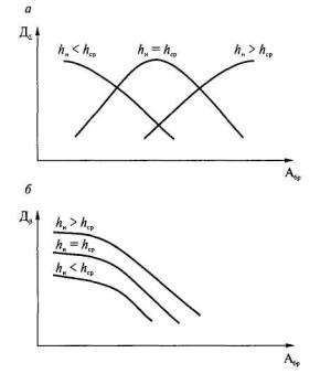 Рис. 4.7. Влияние на ошибки контроля пα, пβ величин нормативного размера hн дефекта и браковочного уровня Aбр (эхо-метод) Следовательно, характер влияния Aбр на показатель ДΣ определяется нормативно-допустимыми размерами hн дефекта (рис. 4.8, а). Так как с увеличением Aбр вероятность недобраковки возрастает (см. рис. 4.7), зависимости «показатель достоверности Дβ - браковочный уровень Aбр» «падающие» (рис 4.8, б), причем для более крупных дефектов вероятность недобраковки меньше. Анализируя влияние на ошибки контроля величины браковочного уровня Aбр, можно сделать вывод, что если нормативный размер дефекта достаточно мал, то вероятность перебраковки тоже мала и значения показателей ДΣ и Дβ близки. Таким образом, могут быть выбраны браковочные уровни, обеспечивающие практически максимальные значения как показателя ДΣ, так и показателя Дβ. При этом отпадает необходимость в такой сложной процедуре, как установление стоимости ошибок.