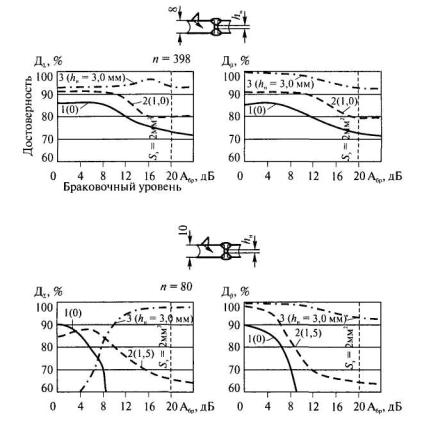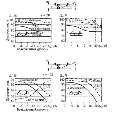 Рис 4.12. Влияние браковочного уровня Aбр на показатели достоверности ДΣ и Дβ ультразвукового контроля зеркально-теневым методом двухсторонних стыковых соединений Таблица 4.2Разность между браковочными (Aбр) и опорными (Ао) уровнями амплитуд ультразвуковых сигналов при дефектоскопии стыковых соединений