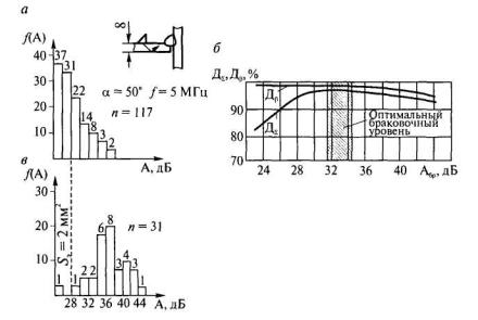 Примечание. Опорный уровень Ао при эхо-методе соответствует Sэкв = 2 мм2, а при зеркально-теневом методе - амплитуде ультразвукового сигнала, прошедшего от генератора к приемнику на пластине, толщина которой равна толщине свариваемых листов. * Числитель - контроль эхо-методом, знаменатель - контроль зеркально-теневым методом. Сопоставление результатов ультразвукового контроля двухсторонних стыковых соединений зеркально-теневым и эхо-методом и их вскрытия позволяет сделать вывод, что мелкие дефекты (соединения 1-й и 2-й категории) с большой достоверностью выявляются зеркально-теневым методом. Однако технология его проведения более сложная. Достоверность контроля сварных соединений, в которых допустимы достаточно крупные дефекты (соединения 3-й категории), практически одинаковая при использовании обоих методов. Рекомендуемые значения браковочных уровней амплитуд ультразвуковых сигналов (см. табл. 4.2) при контроле исследуемых соединений позволяют обеспечить достаточно высокие значения как показателя ДΣ, так и показателя Дβ. Значения этих показателей лежат в диапазоне 86-99 %. 4.3. ОЦЕНКА ДОСТОВЕРНОСТИ НЕРАЗРУШАЮЩЕГО КОНТРОЛЯ УГЛОВЫХ ШВОВВ угловых швах, так же как и в стыковых, наиболее распространенными внутренними дефектами являются непровары. Однако доля дефектности по ним существенно меньше. Выбор браковочных уровней амплитуд ультразвуковых сигналов целесообразно проводить в два этапа (рис. 4.13). Проведена оценка достоверности контроля тавровых соединений. На первом этапе ультразвуковому контролю и вскрытию подлежали сварные соединения, в которых специальной манипуляцией сварочной горелкой обеспечивалось повышенное содержание непроваров (из 344 элементов 174 содержали дефекты). Исследования показали, что при браковочном уровне амплитуды эхо-сигнала, меньшем уровня амплитуды, соответствующего Sэкв = 2 мм2, на 6 дБ, обеспечивается выявление всех дефектов. При контроле соединений, сваренных с соблюдением штатной технологии (второй этап), 148 из 721 элемента имели амплитуды эхо-сигналов из корня шва, превышающие этот браковочный уровень. Из них 31 элемент, как показало вскрытие, содержал непровары. На основе полученных данных о распределении амплитуд эхо-сигналов, соответствующих качественным (рис. 4.14, а) и дефектным (рис. 4.14, б) сварным швам, была проведена оценка влияния браковочного уровня \р на показатели достоверности ДΣ и Дβ (рис. 4.14, в). Максимальное значение показателя достоверности ДΣ ≈ 98 % обеспечивается при браковочном уровне, превышающем амплитуду эхо-сигнала, соответствующую Sэкв = 2 мм2, на 5-7 дБ (рис. 4.14, в). При этом Дβ ≈ 99 %.