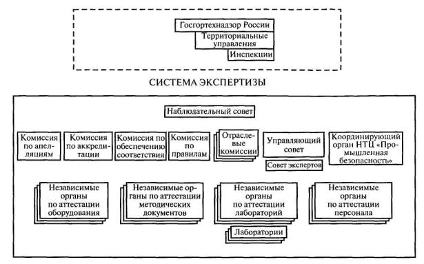 Рис. 5.1. Принципиальная схема Системы экспертизы промышленной безопасности Участниками Системы неразрушающего контроля являются: Наблюдательный совет Системы экспертизы промышленной безопасности, Управляющий совет по неразрушающему контролю, Совет экспертов по неразрушающему контролю, Комиссия по аккредитации Системы экспертизы промышленной безопасности, Комиссия по апелляциям Системы экспертизы промышленной безопасности, Комиссия по обеспечению соответствия Системы экспертизы промышленной безопасности, Комиссия по правилам Системы экспертизы промышленной безопасности, отраслевые комиссии Системы экспертизы промышленной безопасности; Координирующий орган Системы экспертизы промышленной безопасности, Независимые органы по аттестации персонала, Независимые органы по аттестации лабораторий, Независимые органы по аттестации средств неразрушающего контроля, Независимые органы по аттестации методических документов по неразрушающему контролю и аттестованные лаборатории неразрушающего контроля. Наблюдательный совет осуществляет организацию и контроль деятельности Системы неразрушающего контроля в рамках Системы экспертизы промышленной безопасности. Управляющий совет определяет основные направления деятельности в области неразрушающего контроля, принимает решения по реализации единой технической политики в Системе неразрушающего контроля и участвует в процессе аккредитации Независимых органов. Совет экспертов на основе экспертной деятельности разрабатывает предложения по совершенствованию работ в области неразрушающего контроля, методологии и путей практического развития Системы неразрушающего контроля. Комиссия по аккредитации совместно с Управляющим советом по результатам рассмотрения соответствующих отраслевых комиссий принимает решения об аккредитации Независимых органов. Комиссия по апелляциям занимается рассмотрением жалоб относительно решений о возможности аккредитации, жалоб заказчиков к деятельности лабораторий неразрушающего контроля и др. Комиссия по обеспечению соответствия планирует и проводит мероприятия, подтверждающие, что деятельность участников Системы неразрушающего контроля в области аккредитации отвечает требованиям регламентирующих ее документов. Комиссия по правилам совместно с ведущими организациями в области неразрушающего контроля разрабатывает правила и процедуры Системы неразрушающего контроля (по проведению аккредитации, по аттестации экспертов и др.). Отраслевые комиссии решают базовые, профессиональные задачи в областях, соответствующих их компетенции, в том числе о возможности аккредитации. Координирующий орган координирует деятельность участников Системы; ведет документацию по аккредитации Независимых органов, оформляет свидетельства об аккредитации и приложения к ним; оформляет и издает нормативные документы, действующие в системе аккредитации; организует и проводит совместно с отраслевыми комиссиями проверки Независимых органов и их периодический контроль; проводит аттестацию и периодический контроль лабораторий; выдает свидетельства об аттестации и ведет перечень аттестованных лабораторий; осуществляет аттестацию экспертов и ведение реестров в Системе неразрушающего контроля. Независимые органы в соответствии с 