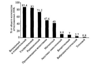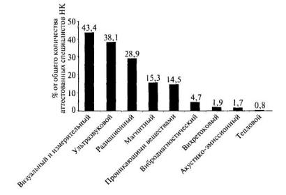 Рис. 5.5. Распределение аттестованных лабораторий (ЛНК) по видам (методам) неразрушающего контроля Работы по аттестации лабораторий стали еще более актуальными после введения Федерального закона от 08.08.01 № 128-ФЗ «О лицензировании отдельных видов деятельности», которым значительно уменьшен перечень лицензируемых видов деятельности, в том числе отменено лицензирование работ по проведению неразрушающего контроля при изготовлении, строительстве, ремонте (реконструкции), монтаже и эксплуатации технических устройств и сооружений на опасных производственных объектах. Аттестация лабораторий позволила унифицировать: во-первых, организационные формы лабораторий, их структуру, подчиненность, взаимоотношения с другими подразделениями и сторонними организациями, обеспечение принципов независимости при неразрушающем контроле как структурных подразделений, так и персонала в области неразрушающего контроля; во-вторых, документированные процедуры, которыми руководствуются лаборатории, включая: организационно-методические документы и документированные процедуры обеспечения качества при неразрушающем контроле; методические документы по неразрушающему контролю и технологические документы на объекты контроля, позволяющие осуществлять неразрушающий контроль и производить оценку качества технических устройств и сооружений видами (методами), включенными в область аттестации лаборатории; документацию по персоналу в области неразрушающего контроля -должностные инструкции и документы, подтверждающие квалификацию и аттестацию по типам технических устройств и сооружений видами (методами) неразрушающего контроля, включенными в область аттестации лабораторий, аттестацию на знание правил безопасности; ведение документооборота и архива лаборатории, наличие процедур проведения работ по неразрушающему контролю, включая оформление результатов контроля, выдачу заключений и их хранение, обеспечение конфиденциальности и охраны прав собственности; в-третьих, оснащенность техническими средствами контроля и их состояние - организацию учета, технического обслуживания, ремонта и метрологической аттестации (поверки), достаточность для организации контроля технических устройств и оборудования видами (методами) неразрушающего контроля, включенными в область аттестации лаборатории. Аттестация лабораторий позволяет комплексно оценить функционирование всех элементов аттестации в Системе неразрушающего контроля, так как при аттестации лабораторий проверяются правомерность и обоснованность применения, достаточность технических средств и методических документов и соответствие аттестации персонала в области неразрушающего контроля существующим требованиям. В Системе неразрушающего контроля ведутся реестры аккредитованных Независимых органов и аттестованных лабораторий и персонала в области неразрушающего контроля. Текущая информация о функционировании Системы неразрушающего контроля, а также информация о разрабатываемых нормативных документах, о формировании необходимых организационных структур размещается на web-сайте: www.safety. ru. Дальнейшим развитием Системы неразрушающего контроля стала разработка в соответствии с постановлением Правительства Российской Федерации от 28.03.01 № 241 «О мерах по обеспечению промыш