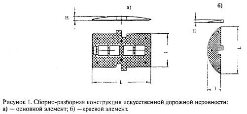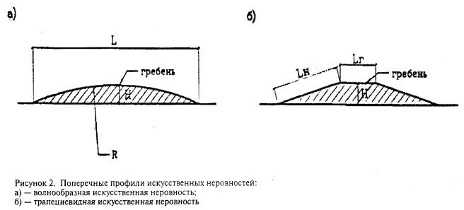 4. Порядок согласования установки искусственных дорожных неровностей4.1 Установка искусственных неровностей на улично-дорожной сети должна быть согласована в установленном порядке с городскими органами управления в соответствии с "Положением о составе, порядке разработки, согласования и утверждения проектов планировки улично-дорожной сети в городе Москве". 4.2 Установку искусственных дорожных неровностей следует осуществлять в соответствии с "Правилами организации подготовки и производства земляных и строительных работ в г. Москве" и настоящим техническим регламентом. 5. Технические требования к оборудованию участков дорог с искусственными неровностями техническими средствами организации дорожного движения5.1 Участки улиц, на которых устанавливают искусственные неровности, необходимо оборудовать техническими средствами организации дорожного движения: дорожными знаками, дорожной разметкой и световозвращателями, изготовленными и установленными в соответствии с требованиями ГОСТ 10807-78, ГОСТ 23457-86, ГОСТ Р 50971-96 и ГОСТ Р 51256-99. 5.2 Перед искусственными дорожными неровностями на дорогах, улицах и проездах следует применять дорожный знак 3.24 "Ограничение максимальной скорости", величина которой принимается равной максимально допустимой скорости проезда через данную неровность. 5.3 Непосредственно перед первой искусственной неровностью, по отношению к приближающемуся транспортному средству, устанавливается информационно-указательный дорожный знак 1.16 "Неровная дорога", а заблаговременное предупреждение водителей о наличии искусственной неровности обеспечивается установкой предупреждающего дорожного знака 1.16 "Неровная дорога". 5.4 Предупреждение водителей о нескольких последовательно расположенных искусственных неровностях обеспечивается применением таблички "Зона действия", устанавливаемой совместно с предупреждающим дорожным знаком 1.16 "Неровная дорога". 5.5 Разметку искусственных дорожных неровностей можно производить краской, термопластиком, холодным пластиком, полимерными лентами. Допускается применение катафотов. 5.6 На поверхности искусственных дорожных неровностей монолитной конструкции должна быть нанесена линия разметки 1.25 "Обозначение искусственных неровностей". 5.7 Искусственные дорожные неровности сборно-разборной конструкции должны иметь чередующуюся черно-желтую (черно-белую) окраску. 5.8 Непосредственно перед искусственными дорожными неровностями с каждой стороны на расстоянии не менее 0,2 м от кромки искусственной неровности наносится линия разметки 1.25 "Обозначение искусственных неровностей". 5.9 После окончания участка дороги с несколькими последовательно расположенными неровностями или единичной неровностью устанавливается дорожный знак 3.25 "Конец зоны ограничения максимальной скорости". 5.10 Если средняя скорость движения одиночных легковых автомобилей на участке дороги, на котором предполагается установить искусственную неровность, превышает на 30 км/ч и более максимально допустимую скорость движения, для которой выбраны размеры искусственной неровности, применяется ступенчатое регулирование максимально допустимой скорости движения на подходе к зоне ограничения скорости с установкой соответствующих дорожных знаков. 5.11 На дорогах и улицах, не имеющих стационарного освещения,