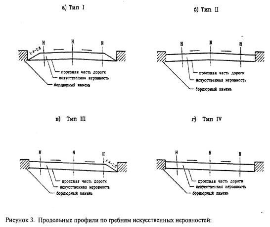 3.2 Искусственные неровности применяются в соответствии с требованиями п. 3.1 и могут быть установлены в следующих случаях: - на улицах, ведущих на территорию, обозначенную дорожным знаком 5.38-5.39 "Жилая зона", "Конец жилой зоны"; - на улицах районного и местного значения, боковых и местных проездах магистралей; - перед детскими и юношескими учебно-воспитательными учреждениями, детскими площадками, местами массового отдыха, стадионами, вокзалами, крупными магазинами и торговыми точками, станциями метрополитена и другими объектами массового притяжения пешеходов, на транспортно-пешеходных и пешеходно-транспортных магистральных улицах районного значения, на парковых дорогах и проездах, внутридворовых территориях; - перед опасными участками дорог, на которых в целях повышения уровня безопасности движения введено ограничение скорости движения 40 км/ч и ниже, установленное дорожным знаком 3.24 "Ограничение максимальной скорости". 3.3 Искусственные дорожные неровности монолитной конструкции могут применяться только на улицах, ведущих на территорию, обозначенную дорожным знаком 5.38-5.39 "Жилая зона", "Конец жилой зоны", а также на парковых дорогах, проездах и внутридворовых территориях; 3.4 Не допускается устройство искусственных неровностей в следующих случаях: - на остановочных площадках общественного транспорта или соседних с ними полосах движения и отводах уширения проезжей части; - на мостах, путепроводах, эстакадах, в транспортных тоннелях и проездах под мостами; - на магистральных дорогах и улицах; - на улицах, где при устройстве искусственных неровностей не будет обеспечиваться требуемая пропускная способность; - на улицах, имеющих более трех полос движения в одном направлении; - на улицах, имеющих проезжую часть, совмещенную в одном уровне с трамвайными путями; - на улицах с установленным маршрутным движением троллейбусов; - на улицах, регулярно используемых маршрутными и специальными транспортными средствами для подъездов к больницам, пожарным станциям, автобусным и троллейбусным паркам, станциям скорой медицинской помощи, гаражам и площадкам для стоянки автомобилей аварийных служб и другим объектам сосредоточения специальных транспортных средств; - в местах расположения смотровых колодцев подземных коммуникаций. - на участках улиц, имеющих продольный уклон более 50 % или радиус закругления дороги в плане менее 300 м; 3.5 Не допускается совмещение искусственных дорожных неровностей монолитной конструкции с наземными нерегулируемыми пешеходными переходами. 3.6 Искусственные неровности следует размещать: - за 20-30 м перед нерегулируемыми перекрестками, у которых установлен дорожный знак 2.5 "Движение без остановки запрещено", в случае отсутствия на перекрестке наземного пешеходного перехода; - за 50-75 м перед наземными нерегулируемыми пешеходными переходами у детских и юношеских учебно-воспитательных учреждений, детских площадок, мест массового отдыха, стадионов, вокзалов, крупных магазинов и торговых точек, станций метрополитена и других объектов массового притяжения пешеходов; - через 50-75 м после въезда на улицу, ведущую на территорию, обозначенную знаком 5.38 "Жилая зона"; - за 50-75 м перед опасными участками дорог и улиц. - за 20 м до и после места расположения смотровых колодцев подземных коммуникаций. 3.7 При необходимости принуди