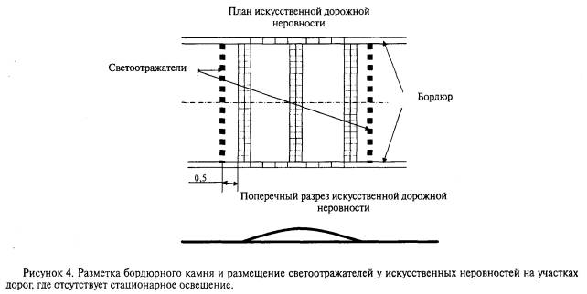 5.12 На дорогах и улицах в городе Москве бордюрные камни с каждой стороны дороги по всей длине поперечного профиля искусственной неровности обозначаются разметкой по ГОСТ Р 51256-99, (рис. 4). 6. Технические требования к эксплуатации искусственных дорожных неровностей6.1 Искусственные дорожные неровности в течение всего периода эксплуатации в обязательном порядке должны иметь разметку, видимую как днем, так и ночью. 6.2 Уборка проезжей части с установленными искусственными дорожными неровностями производится в соответствии с Правилами санитарного содержания территорий, организации уборки и обеспечения чистоты и порядка в г. Москвы. 6.3 В процессе эксплуатации искусственной неровности сборно-разборной конструкции в соответствии с ГОСТ 50597-93 допускается снижение удельного коэффициента силы света (кд × лк(-1)ом(-2) световозвращающей ленты до минимальных значений 35 - для белого цвета, 20 - для желтого. При отслаивании с поверхности искусственной неровности световозвращающей ленты или снижении коэффициента силы света ниже минимально допустимых значений ее необходимо заменить на новую. 6.4 В зимний период дополнительно производится ручная зачистка снега в зоне одного метра по обе стороны от искусственной дорожной неровности. 6.5 В случае выхода в зимнее время на уборку выпавшего снега на участки дорог с наличием искусственных дорожных неровностей тяжелой техники (фейдеров, подъемников), при отсутствии пневмоподъемников для данной техники, необходимо предусмотреть временный демонтаж расположенных на этих участках искусственных дорожных неровностей. 6.6 При единичном демонтаже искусственной неровности сборно-разборной конструкции максимальный процент выбраковки составляющих ее элементов составляет 10 %. 6.7 Ремонт или замена поврежденных конструкций производится в соответствии с ГОСТ 50597-93. 6.8 Поврежденные части и детали искусственной неровности сборно-разборной конструкции должны быть утилизированы соответствующим образом: непригодные стальные детали должны быть направлены на вторичную переработку как лом, пластмассовые и резиновые части должны быть утилизированы в местах, согласованных с территориальными органами Госсанэпиднадзора или направлены на переработку, если это возможно. Материал искусственной неровности монолитной конструкции необходимо направить на вторичную переработку для возможного применения в качестве наполнителя в асфальтобетонные смеси. 6.9 При демонтаже искусственных дорожных неровностей отверстия в покрытии под анкерные болты должны быть заделаны, а поверхность покрытия на месте расположения искусственной дорожной неровности приведена в состояние соответствующее требованиям ГОСТ 50597-93. 7. Технические требования к контролю состояния искусственных дорожных неровностей7.1 Контроль технического состояния искусственной неровности необходимо осуществлять визуально не менее двух раз в год: первый раз не позднее 15 апреля, второй раз не позднее 15 августа. 7.2 Контроль линейных параметров, характеризующих техническое состояние искусственной неровности, следует осуществлять с помощью линейки или рулетки. 7.3 Светотехнические характеристики разметочной ленты, нанесенной на сборно-разборную конструкцию искусственной неровности, следует определять в соответствии с ГОСТ Р 50597-93. 7.4 Контроль коэффициен