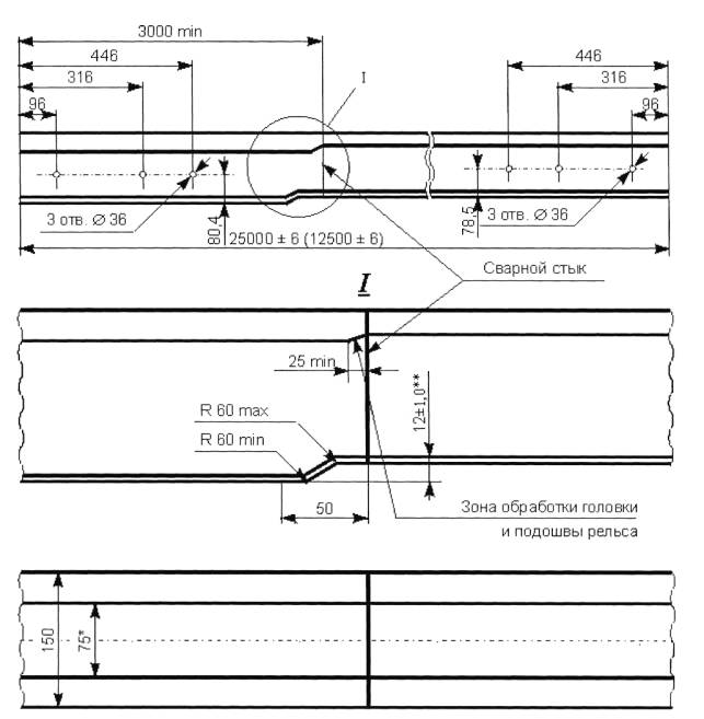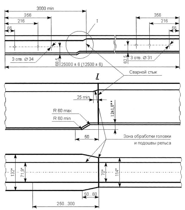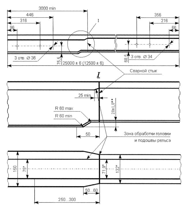 должно превышать по высоте 3.5.3. Подготовленный переходный рельс выпрессованной частью сваривают с рельсом более легкого типа. Общая длина свариваемых рельсов с переходным стыком определяется заказчиком. При сварке переходного стыка вертикальные оси двух рельсов совмещаются, допускается сварка переходных рельсов головкой вниз. 3.6. Механическая и термическая обработка сварных стыков. 3.6.1. В сварных стыках грат