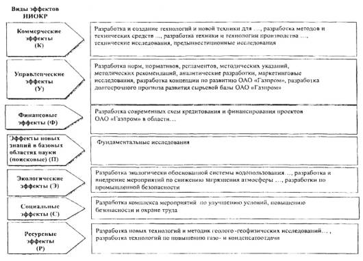 Рис. 2. Примеры НИОКР по классификационным группам К группе «Э» относятся исследования и разработки, основной целью которых является получение экологических эффектов для ОАО «Газпром» за счет: 1) предотвращенного экологического ущерба по видам природных сред или ресурсов (водные ресурсы, растительный и животный мир); 2) снижения размеров текущих платежей организаций ОАО «Газпром» за загрязнение окружающей природной среды. К группе «С» относятся исследования и разработки, направленные на получение позитивных социальных результатов в деятельности ОАО «Газпром». К группе «Р» выполняемых НИОКР относятся исследования и разработки, направленные на рост (экономию) основного ресурсного потенциала ОАО «Газпром» - ресурсов углеводородного сырья. При стоимости НИОКР свыше 3 млн. руб., относящихся к группе «Р», оценка эффективности производится основным методом. 1.3. Факторы, влияющие на эффективность научно-исследовательских работ При формировании оценки эффективности НИОКР необходимо, в первую очередь, выявить и дать оценку изменению эффективности в производственной, хозяйственной и иной деятельности Общества при внедрении научной разработки. Изменения такого рода могут характеризоваться факторами эффективности (результативности, полезности) НИОКР. Реализация научных результатов может позитивно повлиять на основные показатели деятельности ОАО «Газпром» за счет: 1. Увеличения дохода от роста реализации продукции: - повышения производительности основного технологического оборудования и улучшения его использования во времени; - увеличения добычи газа за счет геолого-промысловых, технологических и организационных инноваций и мероприятий; - увеличения добычи углеводородного сырья за счет повышения газо-, конденсато- и нефтеотдачи; - увеличения производительности магистральных газопроводов; - увеличения активного объема газа в газохранилищах; - повышения глубины переработки углеводородного сырья; - увеличения экспортных возможностей; - ускорения темпов строительства; - экономии газа, расходуемого на собственные нужды, и снижения его потерь; - улучшения учета, объемов и качества газа, в результате уменьшения погрешности средств измерения метрологического контроля. 2. Снижения материальных и энергетических затрат за счет: - использования нового оборудования, новых технологий и технологических процессов; - инноваций, направленных на снижение расхода материальных ресурсов; - использования импортозамещающих материалов; - замены используемых в производстве материалов, сырья или полуфабрикатов более дешевыми; - оптимизации графиков проведения и методов производства капитального и текущего ремонта; - уменьшения затрат на капитальный и текущий ремонт; - повышения ремонтопригодности оборудования; - инноваций, направленных на снижение штрафных санкций за несоответствие параметров продукции (газа); - снижения затрат на диагностику, контроль эффективности защиты и обследования состояния сооружений. 3. Сокращения затрат живого труда за счет: - использования нового оборудования, новых технологических процессов; - рациональной организации производственных процессов и управления персоналом; - повышения квалификации персонала; - совершенствования норм и нормативов, системы стимулирования оплаты труда работников; - снижения пот