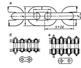 Рис. 1.1. Грузовые цепи: Звенья цепи из Ст.3 изготовляют кузнечно-горновой и контактной сваркой, из остальных материалов - контактной электросваркой. После изготовления сварные цепи испытывают под нагрузкой, равной половине разрушающей. При этом не должно быть остаточных деформаций. По точности изготовления сварные цепи подразделяются на калиброванные и некалиброванные. Некалиброванная цепь предназначена для работы только с гладкими барабанами и блоками, калиброванная - со звездочкой, имеющей специальные гнезда. Отношение диаметра (Д) барабана или блока, огибаемого сварной цепью, к диаметру (d) прутка, из которого изготовлена цепь, должно быть не менее 20 для ручных грузоподъемных механизмов и не менее 30 для грузоподъемных машин. Сварные цепи непригодны для работы с высокими скоростями: допускаемая скорость при работе на гладких барабанах и блоках составляет 1,5 м/с, на звездочках - 0,5 м/с. При превышении этих значений скорости увеличиваются износ участков соприкосновения звеньев и динамические нагрузки, возрастает опасность обрыва цепи. Допустимый износ звена сварной цепи ограничен значением 10% диаметра прутка. Пластинчатые грузовые цепи (см. рис. 1.1б) состоят из стальных пластин, соединенных валиками. Число пластин тем больше, чем больше разрушающая нагрузка. Элементы цепи - пластины и валики изготовляют из сталей 40, 45, 50 и подвергают термообработке (улучшению или нормализации). Все цепи подвергают на заводе-изготовителе испытанию под нагрузкой, составляющей 50% разрушающей. Так как пластинчатые цепи изготовляют без применения сварки, то они более надежны, чем сварные, поскольку в них нет остаточных напряжений и деформация звеньев у них значительно меньше. Движение пластинчатой цепи происходит более плавно, но максимальная рабочая скорость из-за повышенной чувствительности к инерционным нагрузкам не должна превышать 0,25 м/с. Пластинчатые цепи используют только со звездочками. Более широко применяют канаты, которые бывают пеньковые, из синтетических волокон и стальные. Пеньковые канаты разделяют на бельные, не имеющие специальной обработки, и пропитанные горячей древесной смолой. Их изготовляют в трех исполнениях: специальные, повышенной прочности и обыкновенные. В условном обозначении каната указываются наименование, линейная плотность и группа, а также обозначение стандарта. Например: ПБ 120 ктекс Сп ГОСТ 483 - канат пеньковый бельный (ПБ), линейной плотностью 120 ктекс (1 ктекс - масса 1000 м каната в килограммах), специальный (Сп); ПС 144 ктекс Пв ГОСТ 483 - канат пеньковый пропитанный (смоленый) (ПС), линейной плотностью 144 ктекс, повышенной прочности (Пв); ППБ 1924 ктекс Об ГОСТ 483 - канат пеньковый приводной бельный (ППБ), линейной плотностью 1924 ктекс, обыкновенный (Об). Пеньковые канаты изготовляют Æ 10-112 мм с разрывной нагрузкой 7,9-537,75 кН. Наибольшая разрывная нагрузка у специальных канатов, наименьшая - у обыкновенных. Прочность пропитанных канатов на 1-3% ниже, чем бельных, которые по сравнению с пропитанными более гибкие и удобнее в работе, но подвержены гниению и при размокании теряют почти половину своей прочности. Канаты из синтетических волокон обычно не поддаются гниению, плесени и грибковым заболеваниям. Сухие и чистые канаты не замерзают, они имеют хорошие диэлектрические свойства, но при высоких температурах подвержены плавл
