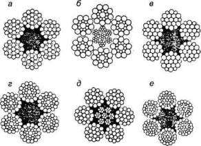 Рис. 1.2. Конструкция стальных канатов: Условное обозначение каната нормируется ГОСТ, например, канат типа ЛК-0 конструкции 6х19(1+9+9)+1 о.с. (ГОСТ 3077). Буквы ЛК-0 означают, что по типу свивки прядей изготовлен с линейным касанием проволок между слоями прядей при одинаковом диаметре проволок по слоям пряди; цифра 6 - количество прядей в канате, 19 - количество проволок в каждой пряди каната, знак «х» - каждая из прядей имеет одно и то же число проволок, (1+9+9) - сечение пряди, где 1 - количество проволок в первом слое пряди, 9 - во втором, 9 - в третьем; знак «+» - имеется сердечник, 1 о.с. - органический сердечник (м. с. - металлический сердечник). При заказе канатов указывают их диаметр, назначение, марку проволоки, вид ее покрытия, направление и способ свивки, сочетание направлений свивки каната и его элементов, маркировочную группу и ГОСТ на канат. Например: канат 27,0-Г-1-Н-1764 (180) ГОСТ 7668 - канат Æ 27 мм грузового назначения (Г), марка проволоки 1, проволока светлая правой крестовой свивки, нераскручивающийся (Н), маркировочной группы 1764 МПа (180 кг/мм2). Наиболее широко рекомендуется применять в кранах в качестве подъемных и крановых элементов следующие конструкции канатов: канаты с органическим сердечником ЛК-Р 6x19 (ГОСТ 2688), ЛК-РО 6x36 (ГОСТ 7668), канат с металлическим сердечником ТЛК-РО 6x36+7x7 (ГОСТ 7669) и ЛК-3 6x36+7x7 (ГОСТ 7669). Канаты разделяют на отрезки определенной длины с помощью зубила, дисковых пил трения, армированных абразивных кругов, сварочной дугой. Предварительно по обеим сторонам от намеченного места канат перевязывают мягкой проволокой Æ 1-2 мм. При этом направление перевязки должно быть противоположно направлению свивки, а длина перевязки не менее 1,5 диаметра каната. Для уменьшения изнашивания и предупреждения повреждений канаты при хранении и эксплуатации покрывают защитной смазкой «Торсиол-35М» или «Торсиол-55». Перед смазыванием их очищают от старой смазки, грязи и следов коррозии, протирают обтирочным материалом, смоченным в бензине. Очищенные канаты смазывают при перемотке с одной катушки на другую, которые могут быть установлены на козлы, погружая при этом канат в ванну со смазочным материалом, подогретым до 60°С. В процессе эксплуатации проволоки канатов изнашиваются, рвутся, перетираются, теряя прочность. Стальные канаты выбраковывают по числу оборванных проволок на длине одного шага свивки, который определяют следующим образом. На поверхность свивки наносят метку (точка «А», рис. 1.3), от которой отсчитывают вдоль оси каната столько прядей, сколько их имеется в его сечении. На поверхности следующей после отсчета пряди наносят вторую метку (точка «Б»). На отмеченном шаге подсчитывают число обрывов и сравнивают с данными, приведенными в табл. 1.1.