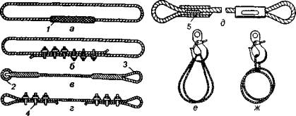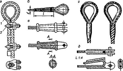 Допустимое число обрывов проволоки на одном шаге свивки в зависимости от степени коррозионного разрушения уменьшается. Канат, у которого диаметр наружных проволок уменьшился в результате поверхностного износа или коррозии на 40% и более, выбраковывают. К каждому канату согласно техническим условиям завод-изготовитель прикладывает сертификат, в котором указывает конструкцию и результаты испытаний каната, в том числе разрывное усилие. Для предохранения петель каната от резких перегибов и истирания применяют коуш, который представляет собой стальное фасонное кольцо желобчатого сечения (рис. 1.4). Форма желоба соответствует диаметру каната. Конец каната (рис. 1.5) соединяют с основной его ветвью специальными зажимами (сжимами) или вплетая проволоки расплетенного каната в основную его ветвь с последующей оплеткой каната стальной проволокой на длине не менее 20 диаметров каната.