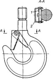 Рис. 1.7. Крюк с замком пружинного замыкания: После изготовления крюк испытывают на прочность под нагрузкой, превышающей его номинальную грузоподъемность на 25%. Продолжительность выдержки под нагрузкой не менее 10 мин. После снятия нагрузки на крюке не должно быть трещин, надрывов, следов остаточных деформаций. Применение литых стальных крюков ограничено из-за возможности образования внутренних дефектов металла при литье. Сборные (пластинчатые) крюки (см. рис. 1.6 в, г) состоят из отдельных пластин толщиной не менее 20 мм, вырезанных из листовой стали 20 или стали 16 МС, соединенных заклепками. Зевы крюков оснащают вкладышами из мягкой стали, что обеспечивает равномерное распределение нагрузки между пластинами и укладку строп без резких изгибов. Эти крюки легче кованых, их применяют на кранах большей грузоподъемности. Крюки соединяют с гибким грузовым элементом грузоподъемной машины, прикрепляя гибкий элемент к проушине крюка (при подвесе груза на одной ветви) или (при подвесе груза на нескольких ветвях гибкого элемента) с помощью крюковых подвесок (ОСТ 24.191.08-81), которые бывают нормальные и укороченные. В нормальных подвесках (рис. 1.8а) траверса, на которой укреплен крюк, соединяется с осью канатных блоков щеками, а в укороченных (рис. 1.8б) блоки размещают на удлиненных цапфах траверсы. Укороченная подвеска позволяет поднимать груз на несколько большую высоту, но ее .можно применять только при четной кратности полиспаста.