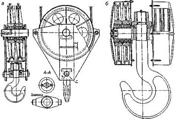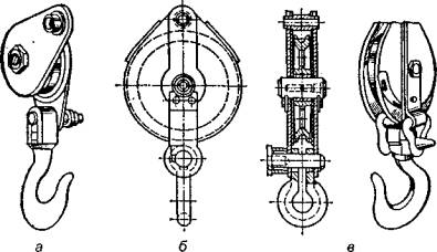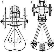 Рис. 1.8. Крановые подвески Кроме грузовых крюков, применяют цельнокованые (рис. 1.9а) и составные (рис. 1.9б) грузовые петли. При одинаковой грузоподъемности они по сравнению с крюками имеют меньшие размеры и массу, однако в эксплуатации менее удобны, так как требуется продевание строп через отверстие петли.