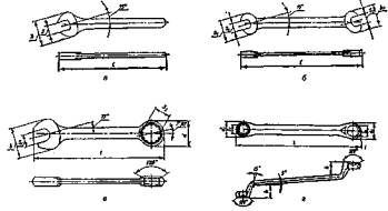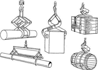 Рис. 1.9. Грузовые петли: Для подъема штучных грузов определенной формы и размеров применяют клещевые захваты, позволяющие сократить время на захватывание и освобождение грузов и уменьшить долю ручного труда. Клещевые захваты подразделяются на захваты для штучных грузов в таре или упаковке и на захваты для штучных грузов без тары. В зависимости от степени автоматизации процесса захватывания и освобождения груза захваты подразделяются на полуавтоматические, обеспечивающие автоматический захват груза и освобождение вручную, и автоматические, обеспечивающие захват и освобождение груза без применения ручного труда. Захваты имеют рычажную систему в виде клещей (откуда происходит их название), свободные концы которых могут быть загнуты по форме груза или иметь специальные упоры или колодки, которыми они прижимаются к грузу и удерживают его силой трения между упором и грузом (фрикционные клещевые захваты). Примеры различного использования исполнения клещевых захватов показаны на рис. 1.10.