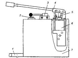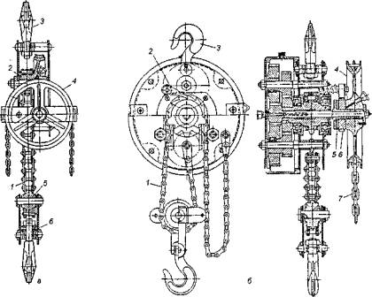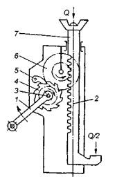 Рис. 1.12. Домкраты: Гидравлические домкраты имеют высокий КПД (0,75-0,8), малые габариты и массу, обеспечивают плавный подъем и спуск груза при весьма точной его фиксации в необходимом положении. Грузоподъемность гидравлических домкратов достигает 2000 кН. В качестве рабочей жидкости в них используют масло индустриальное. Недостатками их являются ограниченная высота подъема груза и малые скорости. Одна из конструкций домкрата приведена на рис. 1.12б. Он состоит из скалки (6), снабженной в верхней части упорной головкой (1). Скалка входит в цилиндрический корпус (5), в нижнюю часть которого плунжерным насосом (4) через систему отверстий и клапанов попадает рабочая жидкость (обычно масло). Насос работает от рукоятки (2), при ее качании перемещается плунжер (3) насоса, и жидкость через нагнетательный клапан поступает в пространство между скалкой и дном корпуса. Для опускания скалки необходимо рукоятку (2) отклонить за пределы рабочего положения. При этом открывается выпускной клапан, жидкость под воздействием силы тяжести груза перетекает из-под скалки в запасной резервуар. При изменении отклонения рукоятки изменяется степень открытия отверстия выпускаемого клапана, таким образом регулируется скорость опускания груза. Числовое значение скорости подъема груза определяется количеством рабочей жидкости, подаваемой под скалку (6) в единицу времени. Так как скорость подъема груза при ручном приводе весьма невелика, то при больших высотах подъема и большой грузоподъемности гидравлические домкраты имеют механический привод. Давление рабочей жидкости для домкратов с ручным приводом принимают до 6 МПа, а для механического привода - в зависимости от параметров примененного насоса - до 30 МПа. Реечный домкрат (рис. 1.13) изготовляют грузоподъемностью до 100 кН с высотой подъема 0,3-0,4 м с ручным приводом. В корпусе домкрата перемещается стальная зубчатая рейка (2), на верхнем конце которой (7) установлена вращающаяся головка - подхват, а нижний конец загнут и образует лапу, что допускает захват груза на малой высоте. Грузоподъемность на лапе равна половине основной грузоподъемности домкрата. Рейка поднимается и опускается вращением рукоятки (1), которая связана с рейкой зубчатой передачей (6). На приводном валу (3) имеется храповое колесо (4), а на корпусе - собачка (5), которая, упираясь в зубья храпового колеса, препятствует опусканию рейки. Поднимать груз реечным домкратом с откинутой собачкой запрещается. Все реечные домкраты по правилам Госгортехнадзора России оборудуются устройствами, предотвращающими произвольное опускание груза. КПД реечных домкратов 0,6-0,8.